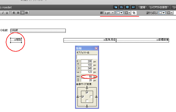 ファイルメーカーでのフィールドサイズの変更の仕方は情報パレットから行ないます。