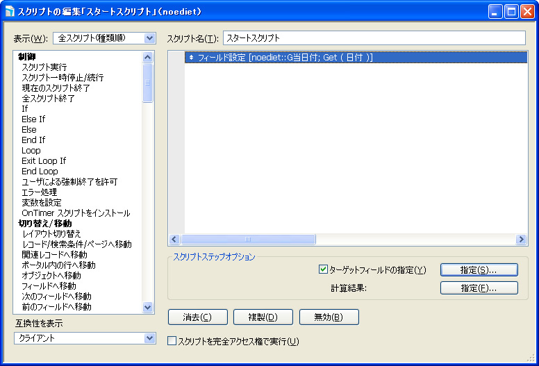 ファイルメーカー8.5の「スクリプトの編集」画面です。