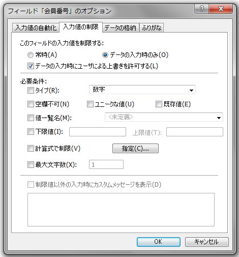 - データの入力時にユーザーによる上書きを許可する:警告を無視出来るかどうか